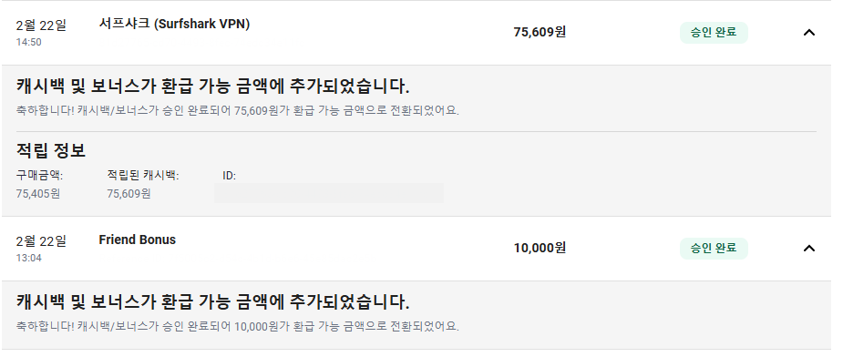Friend Bonus 와 서프샤크 구매 내역과 캐시백 내역을 확인 하실 수 있어요.