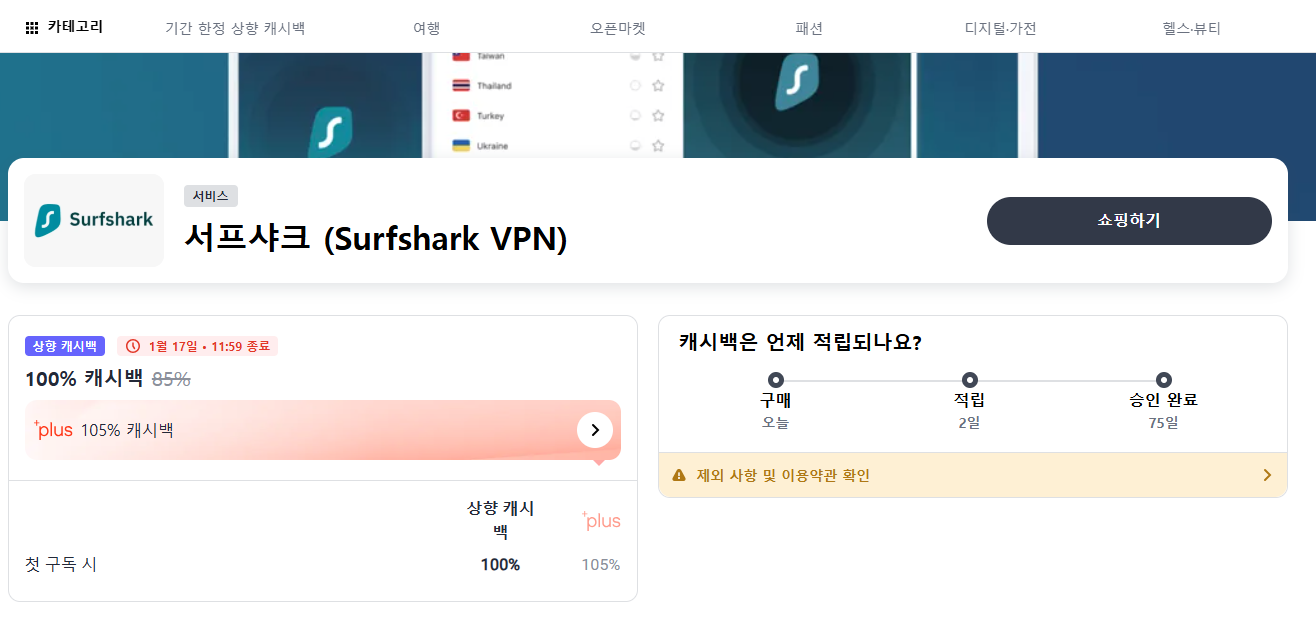 바로 Surfshark VPN 첫 구독 시 100% 캐시백을 받을 수 있는 이벤트예요. (2025.2.21 23:59까지)